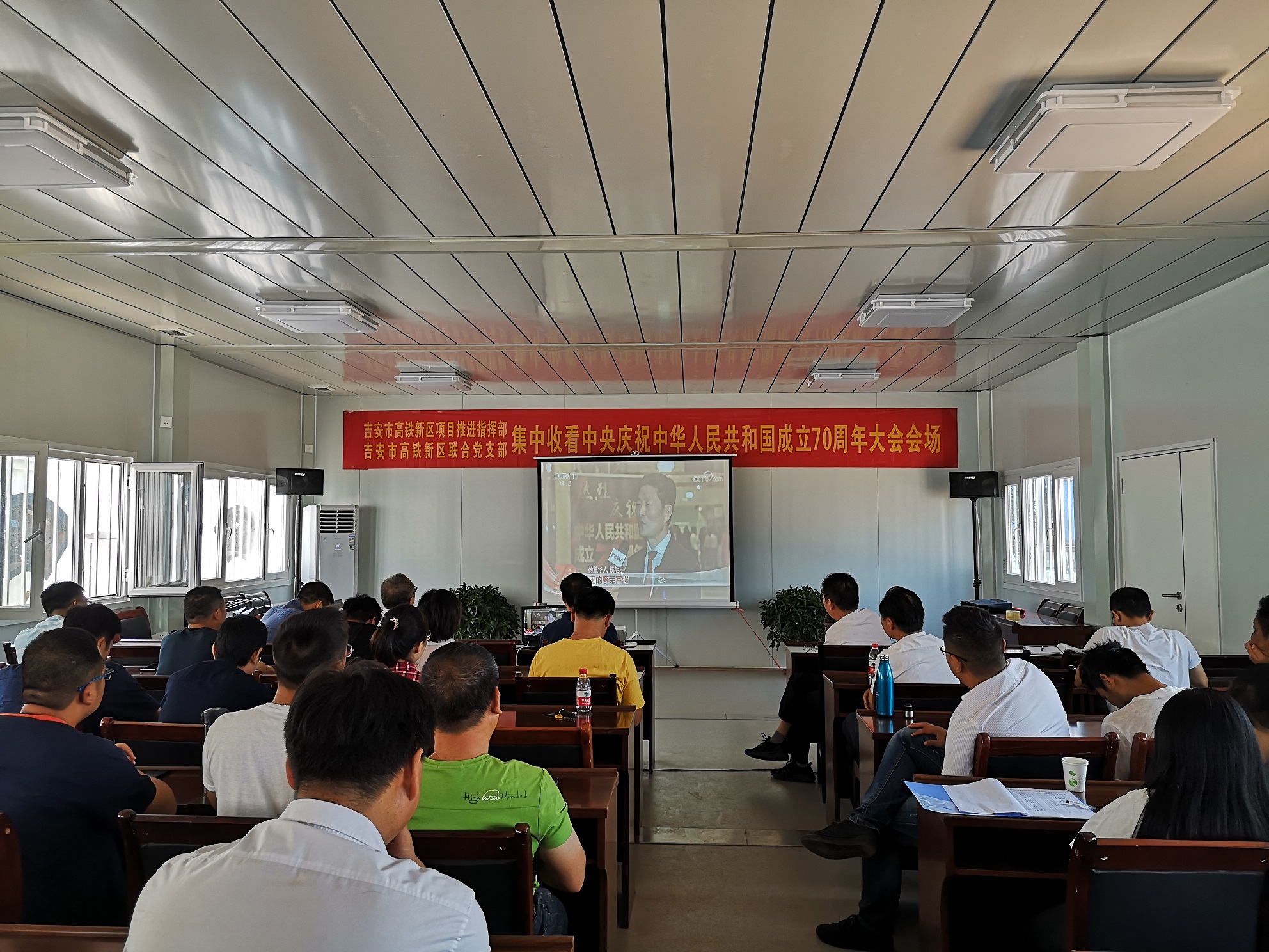 為熱烈慶祝中華人民共和國成立70周年,扎實推進“不忘初心、牢記使命”主題教育深入開展,10月1日,5+1項目建設(shè)指揮部在做好項目生產(chǎn)建設(shè)的同時,組織全體干部職工在大會議室集中觀看國慶70周年閱兵式,共同感懷祖國母親強大的國威、軍威,使大家受到了一次難忘的愛國主義教育。